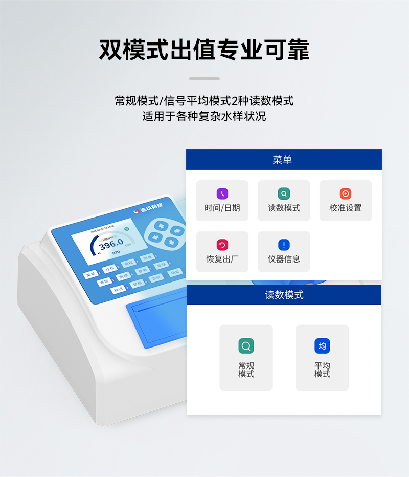 這款測定儀采用白光+紅外雙光束自動切換,測量范圍覆蓋0-4000NTU,無論是高濁度還是低濁度的水樣,都能輕松應對。專業白光低量程模式確保測值精準,而紅外低量程模式則通過色度補償,讓有顏色的樣品測量更加準確。內置常規模式和信號平均模式,讓測量更加靈活,適應不同樣品需求。