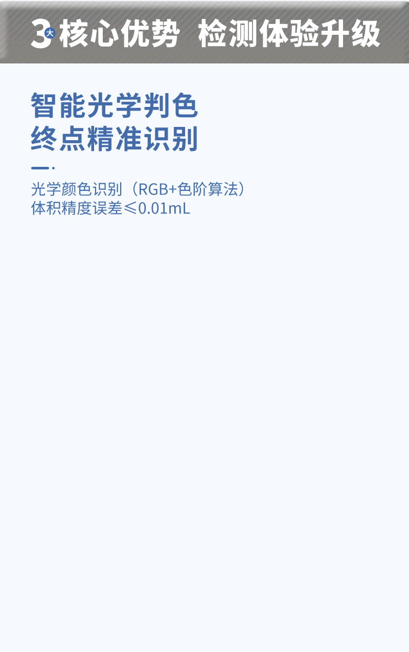 2、模擬人工自動(dòng)進(jìn)行滴定,內(nèi)置RGB模式算法、色階判斷,自動(dòng)判斷滴定速度、終點(diǎn),提高滴定效率;